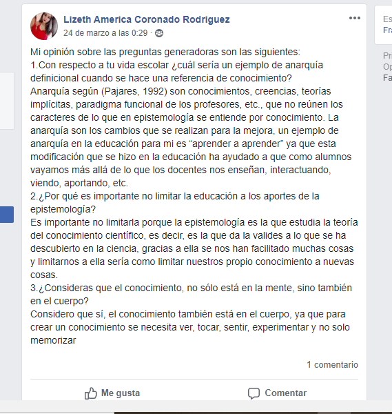 Estas actividades a pesar de a ver sido un poco tediosas por encontrarnos haciéndolo desde casa por las circunstancias, se me hicieron muy interesantes la manera en que las hicimos, así como además lo que aprendí de ellas. Con estas actividades llega a la conclusión de que la educación necesita de la epistemología, así como también de las ciencias pragmáticas y narrativas, ya que cada una de ellas aporta conceptos e ideas diferentes en el conocimiento que llevan a la teoría y la práctica. Así como también se llegó a la conclusión de que no es bueno limitar a la epistemología en la educación ya que es la que genera nuevos conocimientos, así como también es el que le da valides a las teorías.